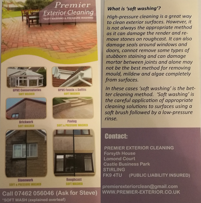 Premier Exterior Cleaning offer a 'soft wash' service to clean the walls of your property. They are offering residents a 10% discount if you contact them and mention you saw the leaflet through the website. 07462-056046 (Ask for Steve)